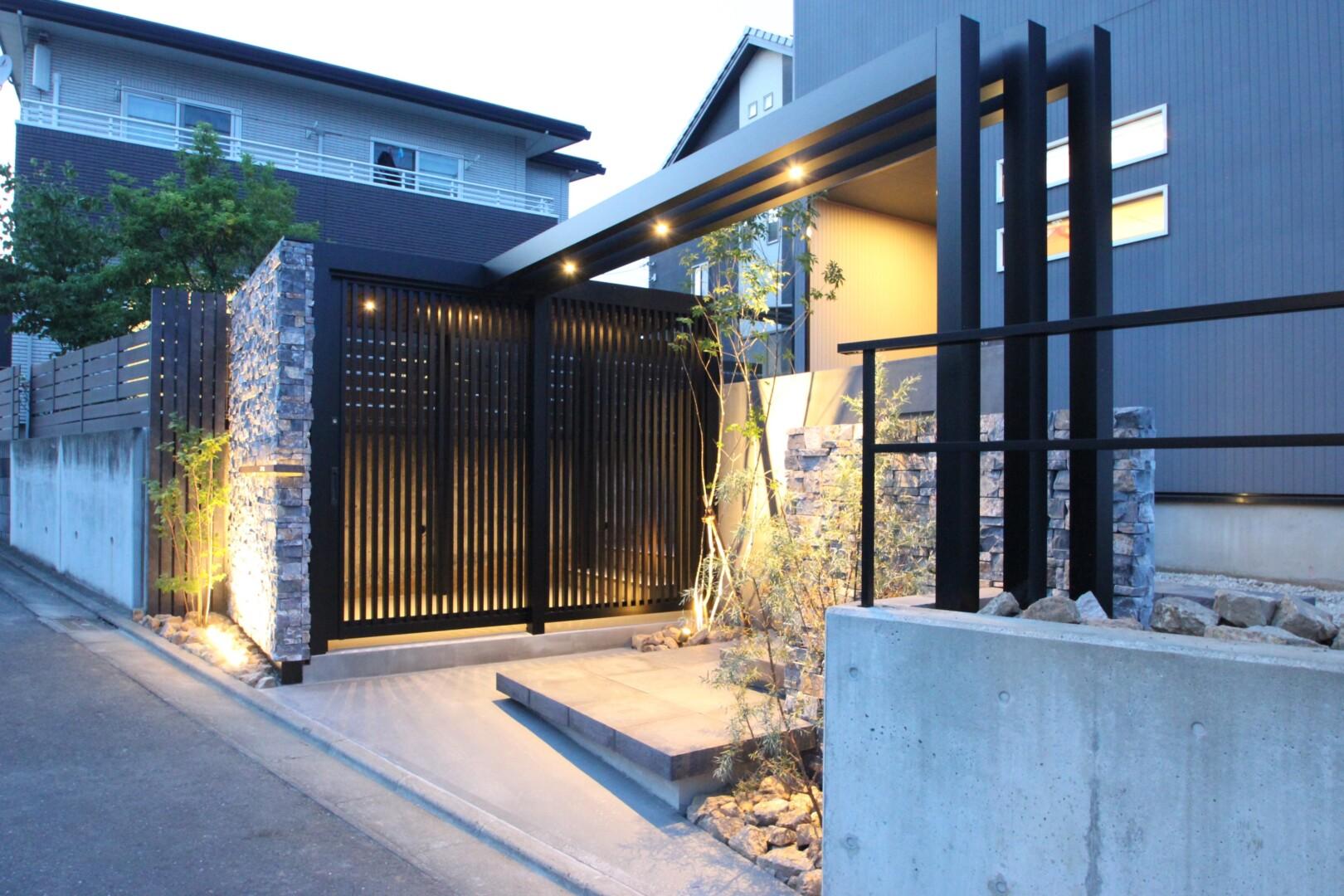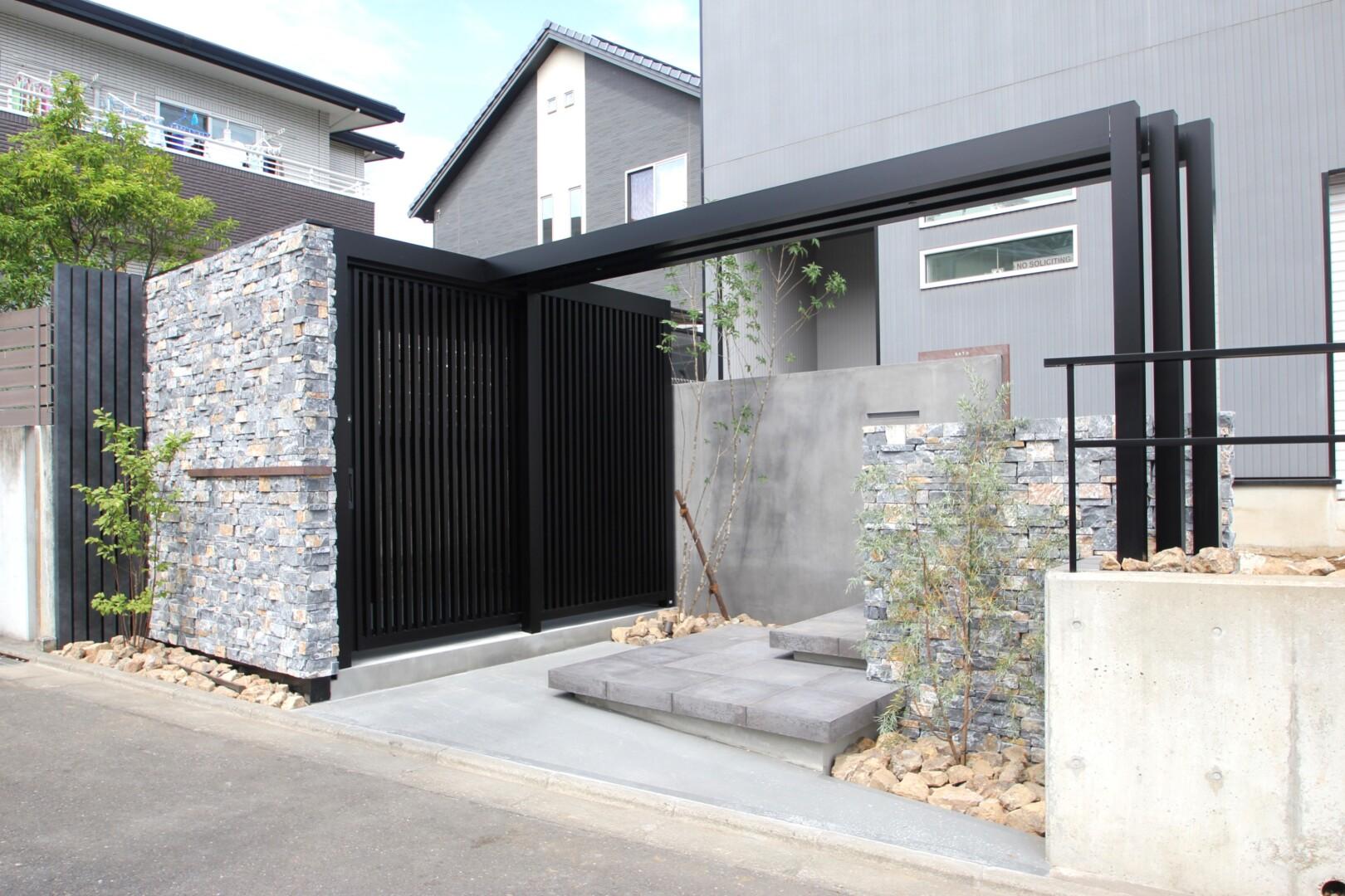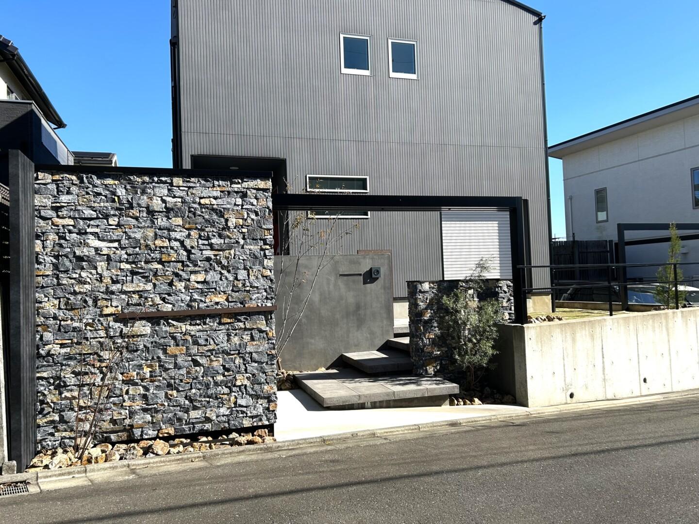 プラスGと目隠しの天然石貼り門柱がモダンでおしゃれな傾斜地の施工例(川越市)